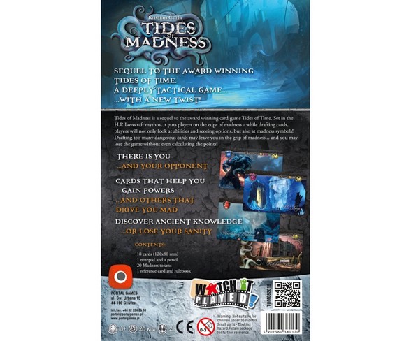 Description The veil between this world, and the past is opening. The Ancient Ones are slowly waking. Their power touches our world, sending dreams and nightmares to tempt humanity into casting long-forgotten rituals. Old books have been rediscovered. Temples, and palaces found. It is the dawn of their awakening, and soon the stars will align. Tides of Madness is the sequel to the award winning Tides of Time. With familiar game-play, and similar rules, Tides of Madness offers a new twist : Madness. Some cards, while powerful, will harm your psyche. You must keep an eye on your Madness or risk losing the game early as your mind is lost to the power of the ancients.Suggested Age: 10 Years and UpMaterial: CardboardType of Game: Strategy and war gamesPlaying Time: 30 Minutes or LessIncludes: Game board, game pieces, instructionsLevel of Difficulty: IntermediateCPSC Choking Hazard Warnings: Choking_hazard_small_partsPackage type: Full gameNumber of Players: 2 PlayersUnique 2 players draftAwesome artworkAges 10 and up. For 2 players Estimated shipping dimensions: 4.38INCH X 7.13INCH X 1.5INCH DPCI : 087-10-3321 UPC : 5902560380170 TCIN : 52232804 Estimated shippimg weight: 0.6POUND