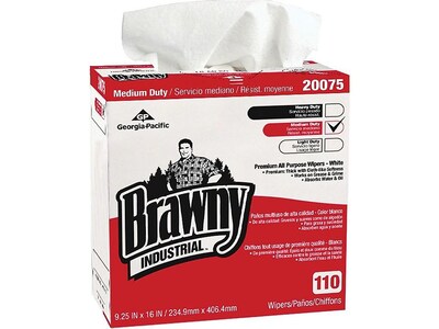 Description Eliminate big messes with this 1100-count carton of Brawny Professional wipers. Keep warehouses clean and safe with these disposable wipers. Each dispenser box contains 110 soft white cloths, which absorb liquids quickly and work equally well on solid particles. These Brawny Professional wipers hold together even when wet, preventing waste. Cleaning wipers are strong and versatile enough for cleaning both water and oil-based spills, yet soft enough for personal use Made from double reinforced crepe (DRC) material and come in white Dimensions: 9.25"W x 16"L Come 110 per box, 10 boxes per carton (1100 total) Dispenser box puts wipers where you need them and dispenses one wiper at a time to help reduce waste Specifications Brand : Brawny Customizable : No Weight : 25.84 lbs. per Carton