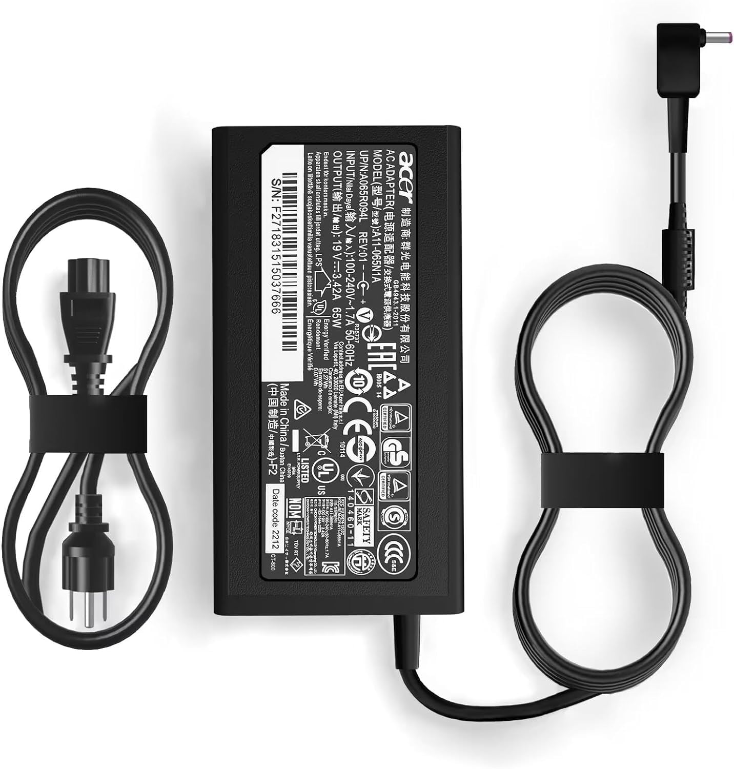 The power brick actually says Acer on it, to my surprise. There is also an LED indicator that lights green when plugged into AC power. Original charger did not have that. The detachable outlet to brick cord (3 prong plugs) is only about 2 feet long, and the brick to laptop cord is 3 feet long, so 5 foot distance from AC overall. Even one extra foot would be preferred.