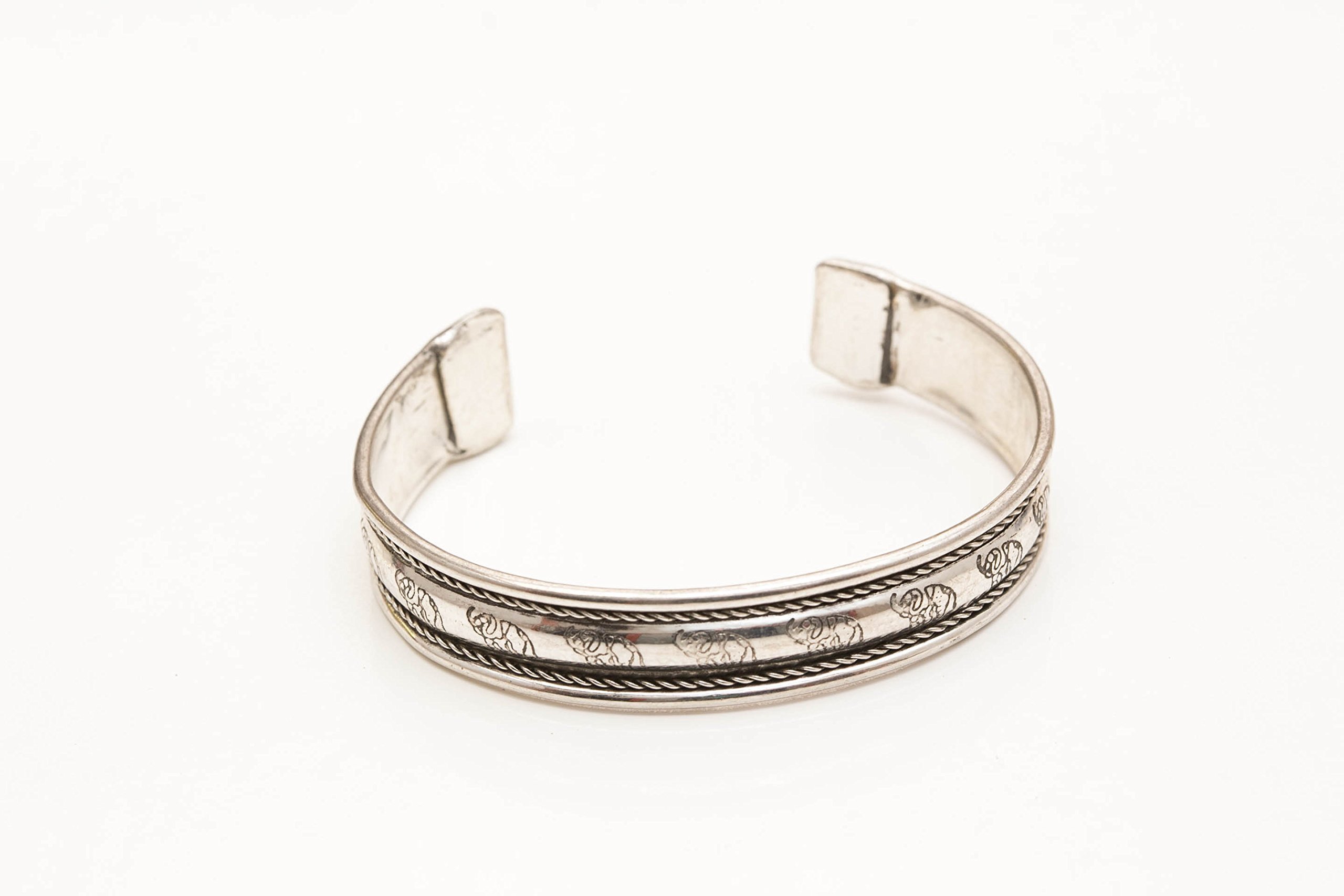 This silver cuff bangle bracelet has elephant carvings and a traditional tribal feeling to it. The silver has been hammered and smoothed for your comfort. Circumference: ~ 7.8", but adjustable! Width: ~0.5" This bangle goes well with all outfits and you can either wear it loose fitting or tighter. It is a lightweight bangle that will be fun to wear for a long time ... Just like the elephant is timeless ♡ Weight <2oz