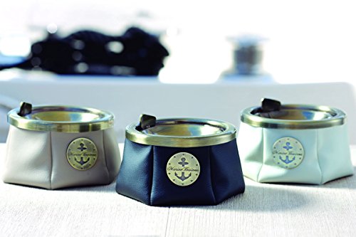 1 pc. | Polyester, Stainless Steel This ashtray, part of the PREMIUM series, is available in 3 different colors (grey, beige and black) with antique gold details to make it a practical and elegant nautical product. The interior is stainless steel and covered by a leatherette fabric (with a decorative screen print). They are heavy, to make them stable, and non-slip to stop them sliding around on the table or other surfaces with the risk of cigarette ends on the floor or deck of the boat . The windproof lid in stainless steel also stops ash from flying out and dirtying the boat. Imported from Spain