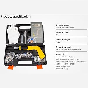 The Nail Wall Fastening Tool is a lightweight, user-friendly device designed for quick and efficient fastening without the need for a power source. Weighing less than 1kg, it features a silencer shoot design that minimizes noise, making it perfect for home use. Capable of penetrating various materials, including steel and concrete, this tool comes with a comprehensive package that includes nails, safety goggles, gloves, and more, ensuring you have everything you need for your projects.