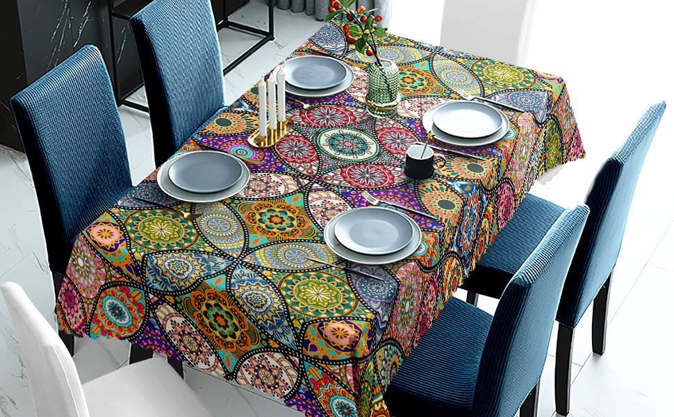 This 60'' x 84'' rectangular bohemian tablecloth features a vibrant, digitally printed design on premium 100% polyester satin fabric. It offers water repellency, stain resistance, and a wrinkle-free finish, making it ideal for both indoor and outdoor use. Easy to clean and maintain, it’s perfect for elevating any dining or patio experience with lasting color and durability.