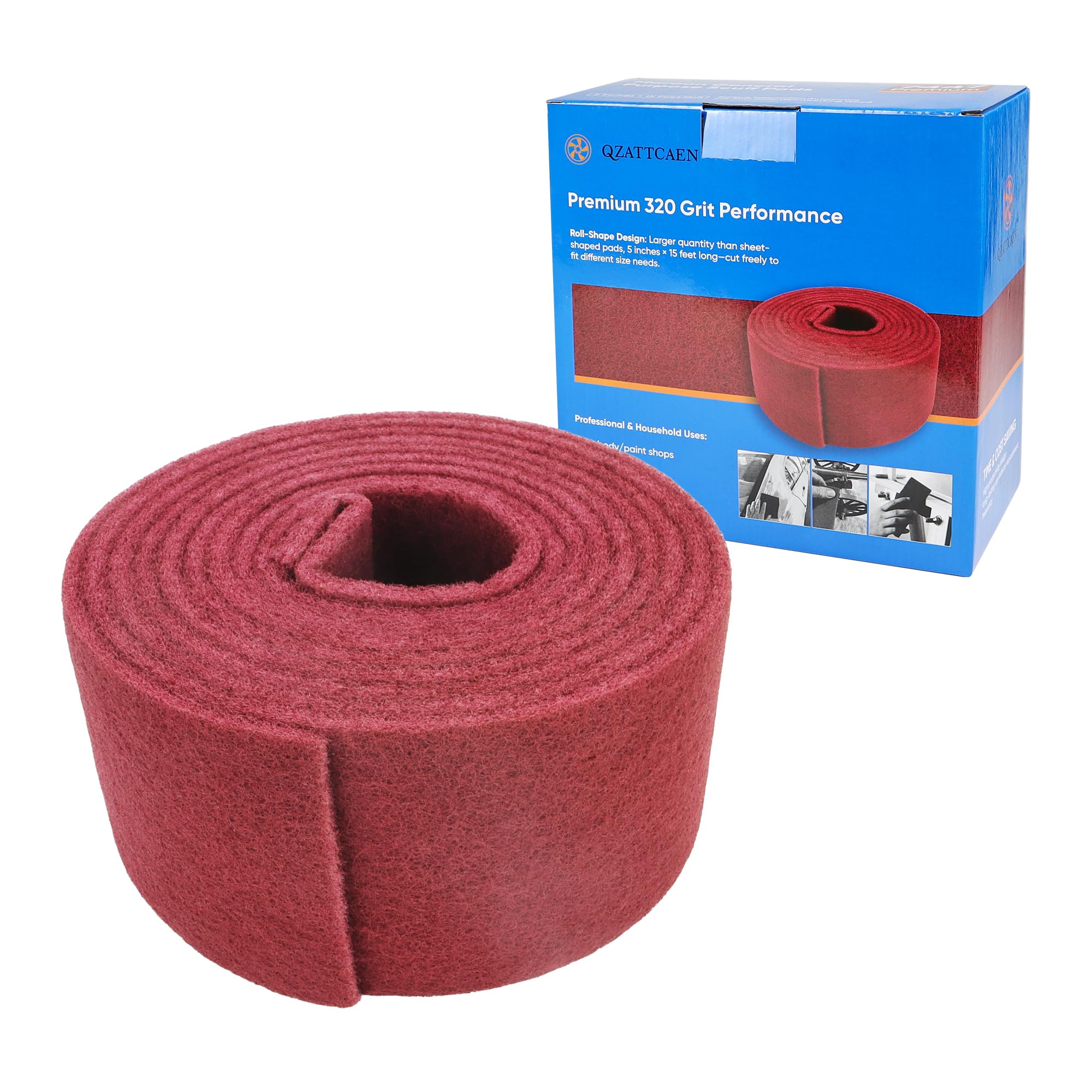 The QZATTCAEN Maroon General Purpose Scuff Pads offer a premium 320 grit aluminum oxide abrasive on a durable, non-woven roll designed for versatile surface preparation. Suitable for wet or dry use, these pads resist clogging and tearing, delivering consistent, fine scratch patterns across multiple materials including metal, wood, and fiberglass. With a customizable 5-inch by 15-foot roll, they provide professional-grade sanding and scuffing performance ideal for auto body, woodworking, and industrial applications.