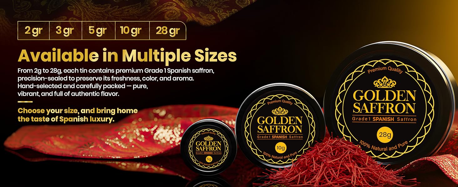Golden Saffron offers 2 grams of premium, 100% pure red Spanish saffron threads, handpicked and organically grown. Packaged in a compact canister, it delivers intense aroma, vibrant color, and rich flavor—perfect for enhancing teas, paella, risotto, and more.
