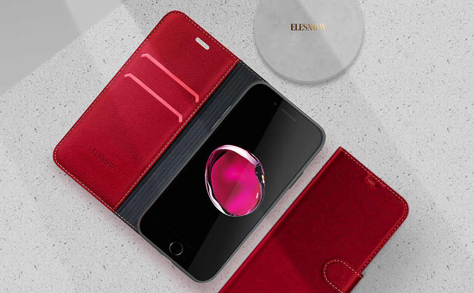 The ELESNOW Case is a premium leather flip wallet designed for iPhone SE 2022, SE 2020, 7, and 8. It features a durable PU leather exterior, flexible TPU for shock absorption, and includes two card slots and a wallet compartment for ultimate convenience. The magnetic buckle ensures security, while the case can be adjusted for hands-free viewing.