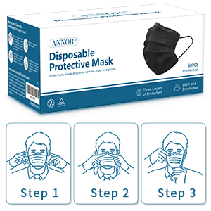 ANNOR Black Face Masks offer reliable daily protection with a 3-ply non-woven design featuring a melt-blown filter layer. Designed for adults, these disposable masks include adjustable memory nose clips and knitted earloops for a comfortable, secure fit. Each pack contains 50 individually sealed masks, ensuring hygiene and convenience for professionals on the go.
