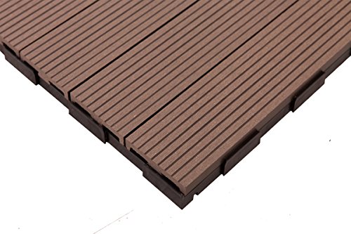 12 x 12 Inch Outdoor Composite Interlocking Decking Tile, 10 Pieces, Coffee Outperforms the Competition 100% recycled materials 3X stronger than other composites Absorbs 90% less water than others Ultra low-maintenance Easy installation, invisible edge after installations Our composite is made from 60% recycled bamboo fibers, which makes it at least 3.6x as strong as other composites - strong enough to hold your grill or hot tub! Worried about rain or snowfall on your deck? Because of our product superior density, it absorbs 90% less water than other composites. Mold, mildew, and decay don't stand a chance!