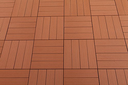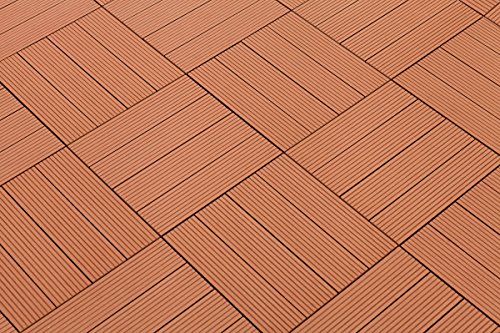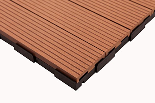 12 x 12 Inch Outdoor Composite Interlocking Decking Tile, 10 Pieces, Redwood Outperforms the Competition 100% recycled materials 3X stronger than other composites Absorbs 90% less water than others Ultra low-maintenance Easy installation, invisible edge after installations Our composite is made from 60% recycled bamboo fibers, which makes it at least 3.6x as strong as other composites - strong enough to hold your grill or hot tub! Worried about rain or snowfall on your deck? Because of our product superior density, it absorbs 90% less water than other composites. Mold, mildew, and decay don't stand a chance!