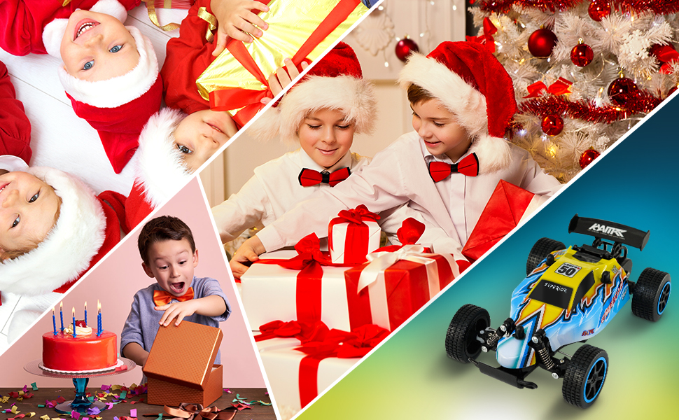 This 1:20 scale RC buggy combines a high-speed 20 mph brushed motor with a 2.4GHz remote offering a 164 ft control range. Equipped with two rechargeable batteries, it delivers up to 40 minutes of continuous play. Designed with a durable PVC body, shock absorbers, and chunky anti-slip tires, it excels in all-terrain conditions, making it perfect for kids and adults seeking an adrenaline-fueled off-road experience.