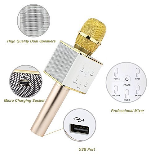 Multipurpose: Bluetooth speaker, Karaoke singing, Car Stereo, instrument recording, interviews, podcasting, etc. Ideal for all vocal applications from singing to speech and usable as bluetooth speaker. Specifications: Product Type: Full Metal K Song Microphone Pickup: Capacitive Bluetooth 2.1 Output Power: 3W*2 Charging Power: DC 5V Frequency Range: 100Hz to 10KHz Maximum SPL: About 115dB 1KHz THD: Up to 1% Reverb Mode: Echo Sound Reverberation Power Supply: Built-in lithium battery Battery Capacity: 1800 mAh Battery Working Time:4~6 hours Phone Support: Supports Connecting to Android, Apple systems. With the APP, you can experience the effects KTV karaoke rooms and functions Operation: Wired Mode 1.Download any karaoke APP/software on your mobile phone 2.Turn on microphone 3.Connect microphone and mobile phone 4.Open karaoke APP to choose songs and sing 5.Record the song as per the instructions on the karaoke APP. Note: Bluetooth function must be disconnected if you choose "Wired Mode". If you want microphone as a bluetooth speaker, turn offmicrophone's echo and volume.Bluetooth have memory function,when mobile phone is restarted,it can be connect automatically. Package Includes: 1 X Microphone 1 X Audio Cable 1 X USB Cable 1 X Storage Box 1 X User Manual