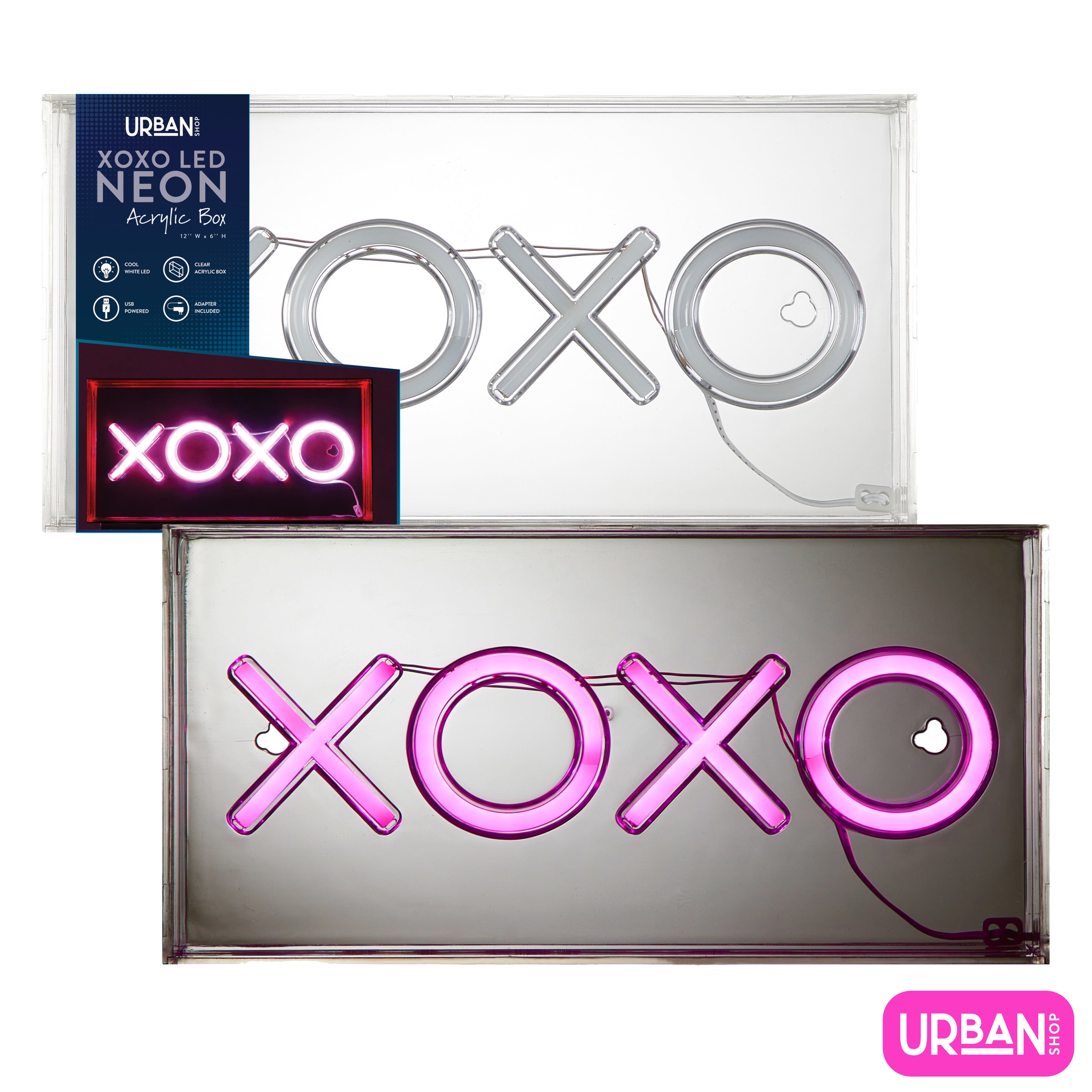 Give your space a colorful look with this Urban Shop LED Neon XOXO Light-up Clear Acrylic Box, Pink. Designed with “XOXO” bright pink neon lights, this light-up acrylic box adds magical charm to your space. With its modern design the Urban Shop LED Neon XOXO Light-up Clear Acrylic Box makes the perfect accent piece for your bedroom, living room or home office. The Urban Shop LED Neon XOXO Light-up Clear Acrylic Box measures 11.81 x 1.85 x 5.90 inches. Use this lighting sign décor on any nightstand, desk or table to create an eye-catching setting you will love. Hang the LED Neon XOXO Light-up Clear Acrylic Box on your wall and watch as the LED bulbs illuminate soft yet vibrant colors throughout your home. The LED Neon XOXO Light-up Clear Acrylic Box is made of durable plastic material that can be wiped clean with a damp cloth for super easy care and maintenance. The Urban Shop LED Neon Light-up Acrylic Box is available in a variety of styles such as Happy, Dream Big, Hustle, Smiley Face, Cheers, and XOXO. Collect them all! Urban Shop LED Neon XOXO Light-up Clear Acrylic Box, Pink Part of our collaboration with the Urban Shop Novelty Lighting Collection Measures: 11.81 x 1.85 x 5.90 inches Can be hung up on a wall or placed on a desk, table or shelf. Wipe clean for easy care and maintenance Features energy efficient LED bulb Includes a plug in power adaptor for easy use Urban Shop LED Neon Light-up Acrylic Box is available in a variety of styles such as Smiley Face, Dream Big, Hustle, Cheers, Happy, and XOXO Perfect for any room of your home!