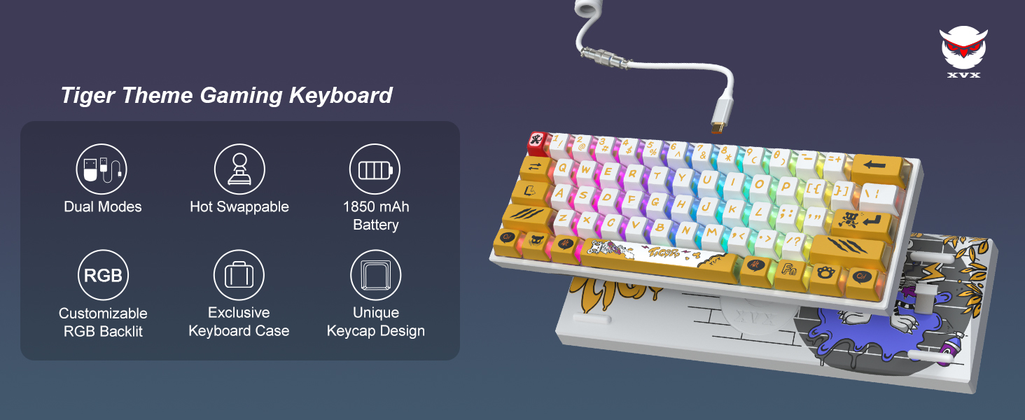 The HITIMEXVX M61 is a versatile 60% mechanical keyboard designed for both gaming and productivity. Featuring a unique tiger theme, it offers dual connectivity options (wired and wireless), customizable RGB lighting, hot-swappable switches, and an impressive battery life of up to 200 hours. Perfect for gamers and professionals alike, this keyboard combines style and functionality in one compact package.