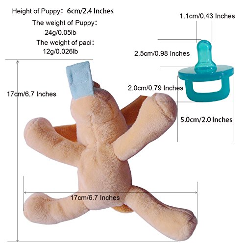 Pacifier Toddler & Pacifier stuffed Animal Holder Detachable,Binky Teething Soother with plush Toys Feature -- 100% edible grade silicone material with binky,Non-toxic,without any chemicals -- 100% safe soft material with stuffed animal,comfortable to babys -- The best companions to make baby calm down and fall in sleep -- with vivid stuffed animal to draw babys attention -- Removed with the pacifier and It is covenient to parents get new one for babys if necessary Dimension 6.7*5.5*2.4inches/17*14*6.0cm(pacifier silicone holder),2.0 inches/5cm(Pacifier) Package 1*Pacifier with pacifier box 1*pacifier toy with gift box