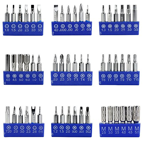 Package included: 4 mm Aluminum Driver - featuring a magnetic socket, rubber grips, and a ball-bearing swivel top Flexible Shaft Extension - snake into hard to reach places Up-to-60 mm Shaft Extension - doubles as a T-handle for extra torque Connector - use this kits 4 mm bits in standard 1/4" drivers 54 bits in the following sizes: Flathead sizes (7PCS): 1.0, 1.5, 2.0, 2.5, 3, 3.5, 4 mm JIS sizes (4PCS): 000, 00, 0, 1 Hex sizes (11PCS): 0.9, 1.3, 1.5, 2.0, 2.5, 3.0, 3.5, 4.0, 4.5, 5.0, 6.0 mm Phillips sizes (5 PCS): 1.0 1.5 2.0 2.5 3.5 Torx sizes (5PCS): T3, T4, T5, T6,T7 Torx Security (7PCS): TR8, TR9, TR10, TR15, TR20 (compatible with non-security) Y2.0 Y3.0 Triangle size (1PC): 2.3 U Tip (1PC): 2.6 Pentalobe sizes (4PCS): 0.8, 1.2, 1.5, 2.0 (iPhone, MacBook Air, MacBook Pro) Square sizes (3PCS): #0, #1, #2 Nut Driver sizes(6PCS): 2.5, 3.0, 3.5, 4.0, 4.5, 5.0 mm