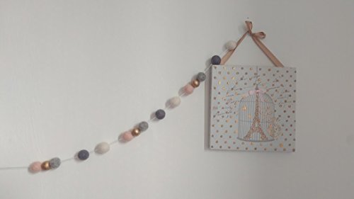 a pretty pompom garland in blush pink, metallic gold, white and greys. A perfect bedroom decoration . ❇ 2cm pink, white and two shades of grey feltballs and also 2cm gold metallic wooden beads ❇ Strung on cotton ❇ the feltball can be gently moved on the string so you can position them yourself ❇ Looks great in nurseries, bedrooms, along fire places, windows or shelves Also brill for.... ❇ Wedding, baby shower, christening , party decorations ❇ Photo prop ❇ Teepees, summer houses and playhouses Need a different length? No problems, just get in touch! Please note - due the the handmade process and the nature of the garlands, please keep well away from children.