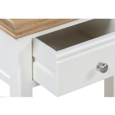 Features we love It's an exclusive design that you won't find anywhere else! Classic two tone style with a contemporary twist Durable build made from solid oak and solid acacia wood Thick solid oak top with grand cornice detailing Soft cream painted finish gives a fresh look Clean and simple knob handles in brushed chrome add a modern touch Plenty of space for bedside essentials with 1 drawer and an open shelf There's no assembly required! All about me The Charleston bedside table has a classic two tone design with country styling that has a contemporary twist, making it perfect for both modern and traditional decor schemes. This neat design has been crafted with quality solid oak and solid acacia wood, it will last the test of time alongside its timeless design. The delicate cream finish gives the bedside table a fresh look and it contrasts beautifully with the thick solid oak table top, which delivers a real sense of quality and a touch of grandeur thanks to the cornice detailing. Housing a single drawer and open lower shelf, there's ample space to keep bedside essentials neatly tucked away, keeping the solid oak table top free for a stylish lamp and alarm clock. The drawer has been made with robust wooden drawer runners, complete with a single clean and simple knob handle in brushed chrome, adding that final modern touch. Need to know Dimensions: H60 x W42 x D40 cm Material: Solid oak and solid acacia wood Finish: Soft cream and oak Hardware: Brushed chrome Drawers: 1 No assembly required