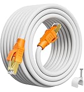 Cat 8 Ethernet Cable 50 ft, High-Speed Ethernet Network Cable Shielded SFTP Cat8 40Gbps 2000Mhz Internet Patch Cord & Gold Plated RJ45 Cable Outdoor Indoor, LAN Cable for Gaming/Router/Modem(15 Clips) The cable comes packaged in a present seal plastic bag. There's no retail printing on here other than the sticker for Amazon's folks. Inside the bag. Is the cable itself rolled up, and a handful of nail-type cable hold downs. It's nice that they included the hold-downs, so if you have to route your cable around things, you can nail it to your baseboard or whatever is convenient. The cable itself seems to be very sturdily made with a pretty heavy rubberized feeling jacket that is round. The ends appear to be crimped well, with a mirror finish to the connectors themselves and a heavy orange jacket on the connector for extra strength to the connection. I like the way this cable is constructed. It's heavy-duty and flexible, and with that extra heavy connectors, it seems to be fairly sturdy. I like that. It's flexible enough that you could bend it around obstacles to run it where you need to.