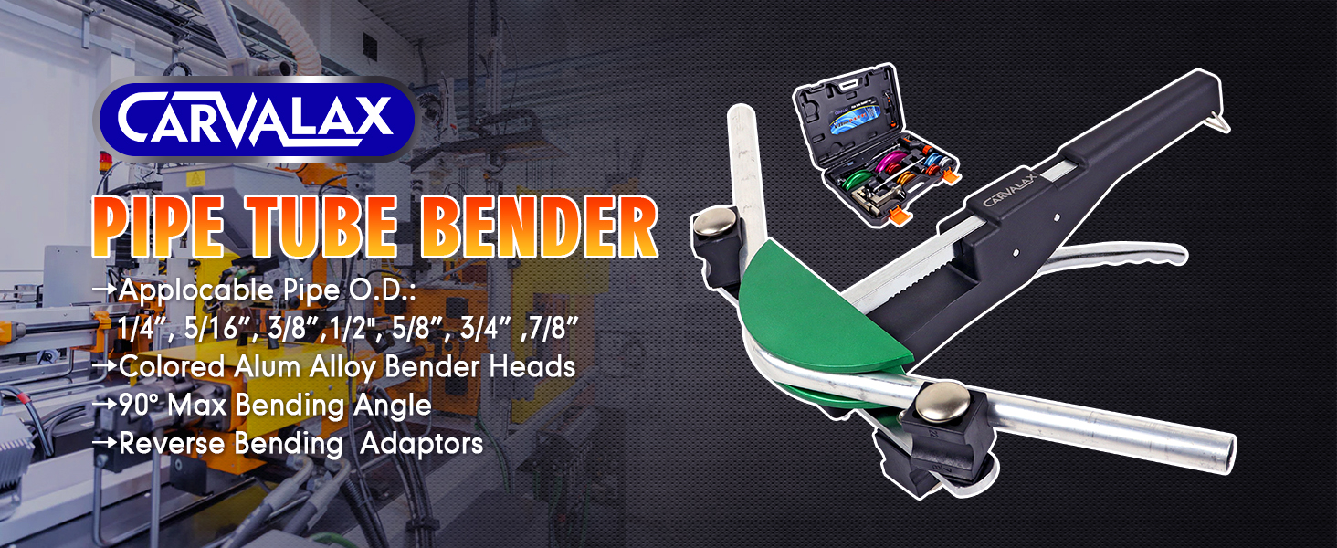 The CARVALAX Pipe Tube Bender Set is a professional-grade, hand-powered tool kit featuring 7 color-coded aluminum heads for pipe sizes 1/4” to 7/8” O.D. Designed for HVAC, plumbing, and hydraulic work, it offers both forward and reverse 90° bending with an ergonomic ratcheting handle for reduced fatigue. Built from durable carbon alloy and aluminum, it includes a pipe cutter, deburring tool, and a portable storage case, making it the ultimate all-in-one solution for precise, efficient tube bending.