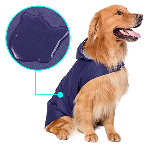 About Products This is waterproof dog raincoat for the rainy but warm days as pet doesn't enjoy walking in the rain without one. It is light weight rain coat with pocket and reflective safe stripe. Feature 1, Dogs rain coat has a thin waterproof layer and a mesh lining which is the same as that in tracksuits. 2, Light weight material perfect for the rainy but warm days. 3, Raincoat reflective stripe on the back ensures pets can be seen at night/in the dark. 4, The intimate snack pouch makes your pet eating whenever and wherever possible. Or keeping treats and poop bag. 5, Dog waterproof rain jacket help to keep pets dry and comfortable in wet weather. Size Detail Size:----Girth ----- Neck ----- Length 3XL: ----62cm------39cm-----48cm 4XL: ----76cm------46cm-----58cm 5XL: ----88cm------56cm-----68cm Warm tips: Before order, please measure your pet GIRTH,NECK,BODY size and select the best fit size. Package Included: 1 * Waterproof Dog Rain Coat