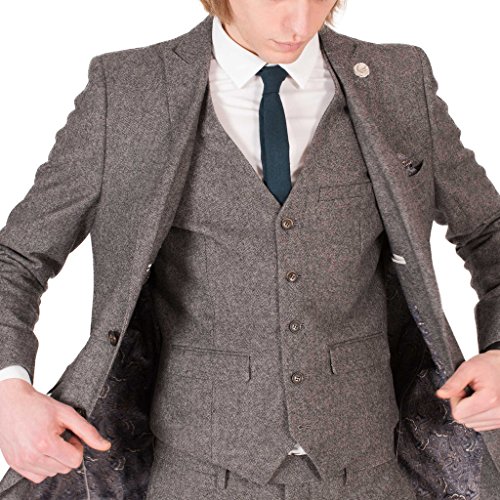 Men's 3 piece 2 button grey, blue or camel slim fit suit. All suits come with 1 jacket, waistcoat and 1 pair of flat fronted trousers. Double vent at back. Suit jacket 2 front & 1 top pocket. 2 inside pockets & 1 pen pocket. Peak lapel with flower shaped lapel pin. 3 button cuff. Waistcoat 5 buttons, 2 flap pockets & 1 top pocket & adjustable strap on the back. Trousers 2 front pockets & 2 welt pockets with button on the back.