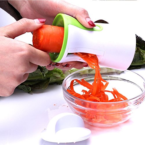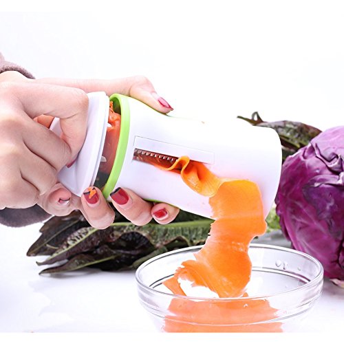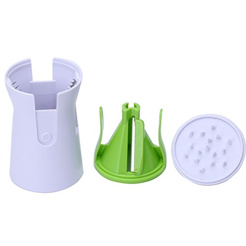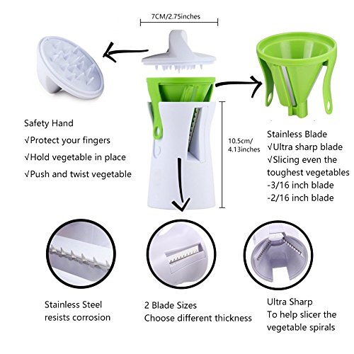 Features and Benefits: - Beautifully slices, spiralizes and cuts firm fruits and vegetables - including carrots, zucchinis, cucumbers and more! - Easy self-contained storage: Safe to operate and easy to clean: dish-washer safe too! - Quickly and easily adjust the size of the spirals: includes 2 rust-free stainless steel blades: forever sharp and never rusts! - Made from premium quality, 100% BPA free, food grade safe, durable reinforced ABS plastic: won't bend or crack! - Non-electric, small kitchen gadget: easy to store away and ideal for camping. HOW TO USE -Remove the cap from the spiral slicer -Choose your blade! Grip the green, plastic blade guide. Pull away from the slicer body. Turn to align the blade of your choice and then reattach. -Place the vegetable into the center of the slicer cone. With firm pressure, twist the vegetable for perfect noodles. -Use the cap when the vegetable gets very short to minimize wastage. -After use, simply rinse under running water. Use supplied brush to remove vegetable residue. Dishwasher safe! For best results, use firm, large vegetables that easily fit into slicer.