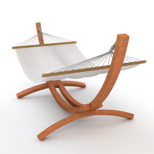 You can create the perfect atmosphere for relaxation in your garden, patio or conservatory with this lovely hammock set. Easy assembly with incl. tools and illustrated assembly instructions. Each item is unique due to the natural material used and may vary slightly in colour and structure.AMPEL 24, Single hammock stand Mauritius 310 cm | Weather-resistant Siberian larch wood | Set incl. hammock Tobago in off-white with spreader bars | Stabilising kit Hammock stand: Colour: brown Dimensions: 310 cm x 120 cm x 120 cm Material: multilayered and pretreated Siberian larch wood Supporting beam: 60 x 60 mm Distance between feet: 110 cm Weight: 22 kg Max. user weight: 150 kg Length: 310 cm Weather-resistant Assembly: Illustrated instructions in English Hammock Tobago: Colour: off-white Material: 100% cotton, 260g/m² Size: 200 x 120 cm Spreader bars: made of Chinese cherry wood 120 x 3,5 x 2,5 cm 14 cords on each end, galvanised metal rings Max. user weight: 120 kg Total length (loop to loop): 275 cm Care instructions: Please store hammock in a dry environment when not in use. Please treat hammock stand with wood oil on a regular basis. Package details: Box 1: 13,0 x 158,0 x 36,0 cm, 24,0 kg Box 2: 10,0 x 125,0 x 10,0 cm, 2,7 kg