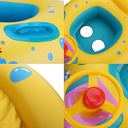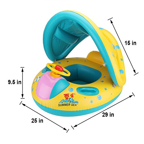 Product Detail Brand: HAHAone Specification: Model: Inflatable Float Seat Material: Environmental PVC Inflated outer diameter: 72 * 58CM Inflated inner diameter: 28 * 28CM PVC thickness: 0.18cm Foot hole: 10CM Main Color: as picture show Recommended Age: less than 3 years (if the child is overweight, but also to determine the weight according to the child) Separate air chambers for safety Safety valves. Durable handles . Rotatable wheel with soft sound button Shade cover protects against harmful UV rays Suitable for children 6 months - 3 years Inflatable method 1, first filled the base and tent 2, the charge of the tent and the seat of the seat connected to the bottom of the seat inside 3, the tent at both ends of the plunger connected with the base, put the top of the tent installed Bottom seat: inner strength 28cm, within the width of 26cm Inflatable outside: 72CM long * 58CM wide (cm) Package Include: 1* Baby inflatable swimming ring Notice: This is not a lifesaving device. This baby float can be only used in shallow water and should be under the supervision of adults NEVER leave child unattended Keep away from the fire or sharp objects