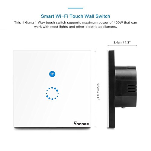 Note:Neutral Wire Needed Specification Type: Sonoff Touch Wi-Fi Switch (EU Standard) Material: Flame retardant ABS, hard glass Item Color: White Rated Voltage: AC 90V-250V, 50 / 60Hz Max. Load: 400W / 2A Wi-Fi: 2.4GHz, IEEE 802.11b / g / n Connector: EU standard Supported operating system: Android 2.3 or higher and iOS 6.0 or higher Certification: CE, RoHS Size: 8.6 * 8.6 * 3.4cm / 3.4 * 3.4 * 1.3 "(L * W * H) Package Included 1 * touch switch 1 * Warranty card 1 * Packing Box