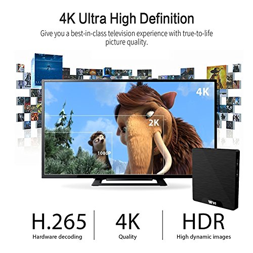 Q&A Q: What is the purpose of the TV box? A: To stream previously played TV programs, use it to various streaming apps, play games, music, and more on your TV. Covert your TV into a pc. Q: Do the TV box need internet to use? A: Yes. You can use Ethernet or WIFI as you like. Q: Will this only work on a smart TV? A: This will work on any TV as long as the TV has the HDMI connector. Q: Does it difficult to use? A: No, it is easy to operate. Android TV Box has HDMI and AV out port. You simply plug the box into your device by HDMI for HD or RCA for standard definition. 2.0 USB ports, connect with your mouse and keyboard to help you operate more conveniently. Basic Features: OS: Android 7.1 CPU: Amlogic S905W Quad Cortex-A53 2.0GHz 64bit GPU: Penta Core ARM Mali-450 RAM: 2GB DDR3 Flash: 16GB EMMC FLASH LAN Ethernet: Up to 100M Wifi: 802.11 b/g/n 2.4G High Definition Video Output: 4k*2k Card Reader: TF card (32GB max.) USB Mechanical Hard Disk 2.5/3.5inch 4TB Storage LED Indicator: Blue Ports: 2*high speed USB Port; 1*SPDIF; 1*HD A Type Port; 1*RJ45; 1*AV Port; 1*DC(5V) in Port Graphics & Display: 1. Real-time decoding of MPEG-1/2/4, H.264, H.265/HEVC, VC-1 2. H.264/AVC Base/Main/High/High10 profile @ level 5.1; up to 4Kx2K @ 30fps 3. Support video encoder for H.264 at BP/MP/[email protected] 4. H.265/HEVC Main/Main10 profile @ level 5.1 High-tier; up to 4Kx2K @ 30fps 5. VP9 profile 0; up to 4Kx2K @ 30fps 6. AVI, H.264, VC-1, MPEG-2, MPEG-4, DIVD/DIVX, Real8/9/10, RM,RMVB, PMP, FLV, MP4, M4V, VOB, WMV, 3GP, MKV 7. HDMI 2.0a output up to 4K 8. HDMI 3D video formats 9. AV(CVBS) 480i/576i Packages: 1 x W95 TV box 1 x IR Remote control 1 x HDMI cable 1 x Power adapter(UK Plug) 1 x User manual