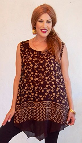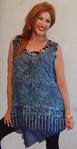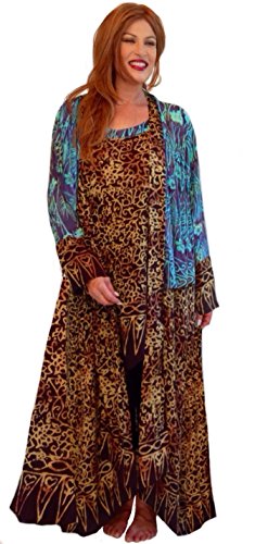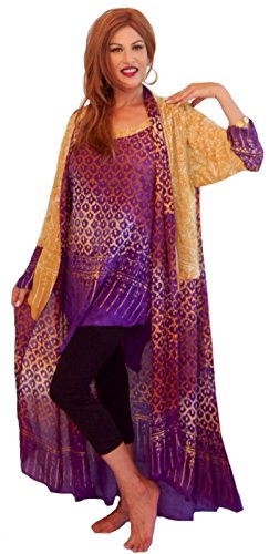This light and flowing jacket and cami set will have a magical effect on your look. The sleeveless cami is designed with a scoop neckline, and both the neck and arm openings have contrasting inset trim. Overall length is extra generously below-the-hip, and the hemline is fashionably angled to a point at the center front and back. The full-length jacket has a loose and swingy a-line form, long, wide sleeves and a narrow, contrasting lapel. You'll just adore the 'floaty' way this garment moves. Made up in a patchwork of lighter weighted contrasting Balinese batik fabrics. Very versatile, wear this over black or white leggings, pants or skirt....