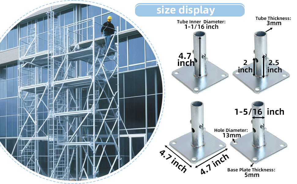 This set of four galvanized scaffold base plates measures 4.7" x 4.7" with a 5mm thickness and dual adjustable holes for flexible height settings. Made from durable QB235 steel with wide welds, these plates provide a strong, stable foundation for scaffolding in construction and maintenance projects. Easy to install with a bolt-on pin lock system, they support heavy loads and resist external forces, ensuring safety and efficiency on any job site.