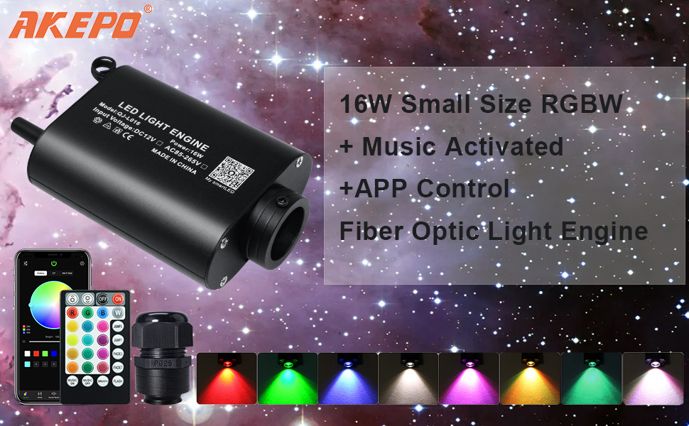 The AKEPO 16W Bluetooth APP Control Fiber Optic Light Source is a compact, polished aluminum LED engine designed for ceiling mounting. Featuring sound-activated modes, 17 static colors plus dynamic RGBW effects, and over 16 million colors via Bluetooth APP control, it offers customizable ambiance for cars or homes. Powered by 12V DC with a 28-key remote and backed by a 2-year warranty, it delivers up to 50,000 hours of vibrant, energy-efficient lighting. Note: fiber optic strands sold separately.