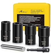The Topec 5-Piece Heavy Duty Nut Bolt Remover Set features impact-resistant 42CRMO steel construction with a reverse spiral groove design for superior grip on stripped, rusted, or rounded bolts and nuts. It includes five sockets ranging from 3/4” to 1” with a 1/2” impact-rated square drive, compatible with various hand and pneumatic tools. Packaged in a durable plastic case with engraved sizes, this set is engineered for professional-grade durability and portability.