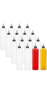 These squeeze bottles are nice for a variety of craft, travel or cosmetic uses. They are easy to squeeze. The opening for filling them is small but not too small to make filling difficult - a smaller funnel will do the job. The tops are secure - no leaks. All in all a nice product with multiple uses.